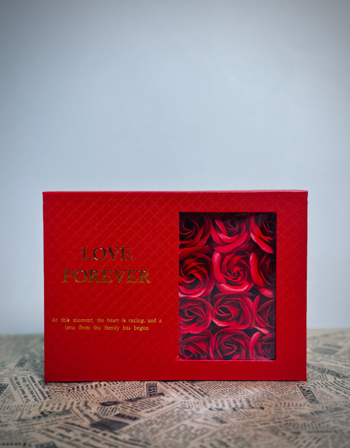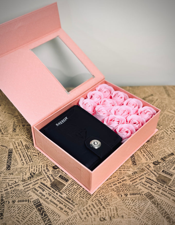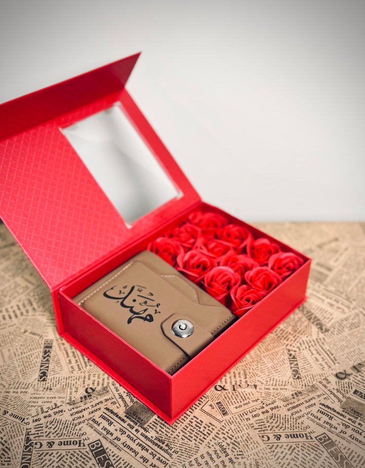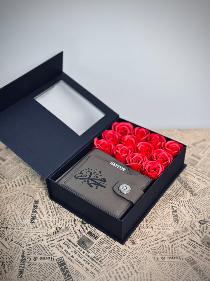 This premium gift box includes beautiful flowers and a high-quality imported wallet — with the option to engrave your name or any word you love by laser for a personalized touch.
